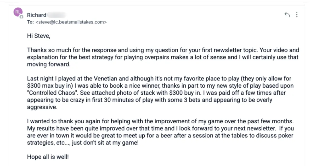Just two days later, he emailed me again (see screenshot) to share that he won an $1,100 pot at $1/3 with 6-8 suited. He explained how he played the hand exactly as I teach in the course, and how the Masterclass has already transformed the way he approaches each hand and opponent.