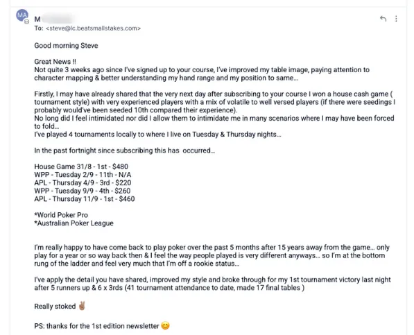I've gone back and forth with Steve over email, and in one of his first messages he mentioned that he won a $1000 pot at $1/3 by 3-betting 8-9 suited preflop, something he wouldn't have done before going through the course.