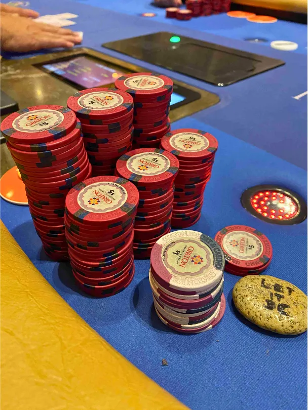 Update 10-7-25: Tom sent me another chip stack pic where he says he was, "Playing balanced, punishing limpers and showed maybe three good hands, gaining a lot of respect - so of course, he bluffed a little after that, cashing out with a $1,150 win at $1/3 (see second chip stack pic).