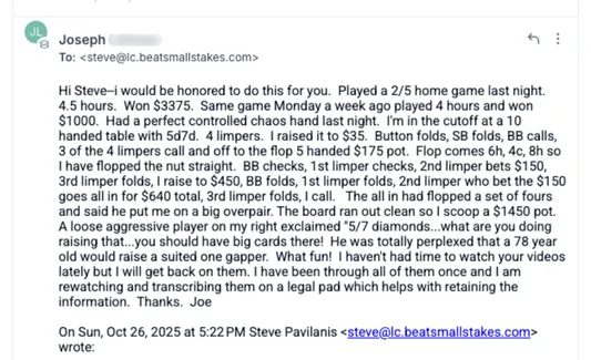 He then sent me the following email in mid-September, 2025, along with a photo of a nice $600+ win he had at the Venetian in Las Vegas off of a $300 buy-in.
