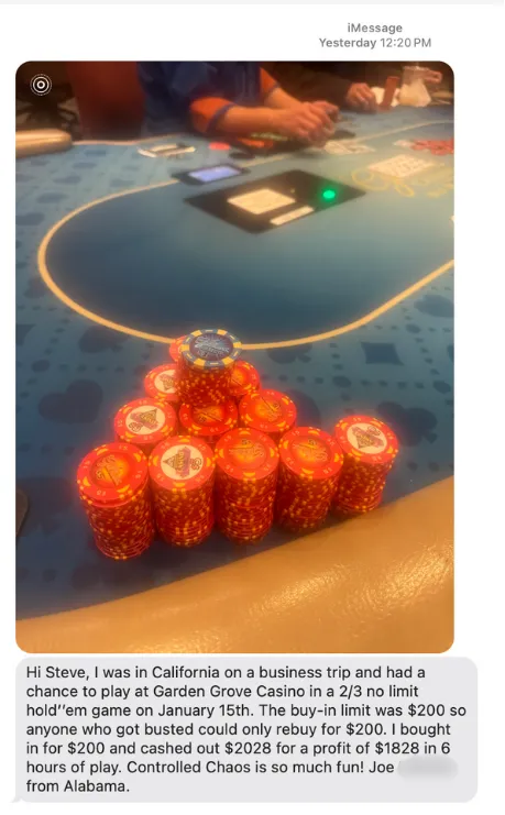 In January 2026, he texted me about his latest win: $2,028 in just 6 hours at $2/3.
